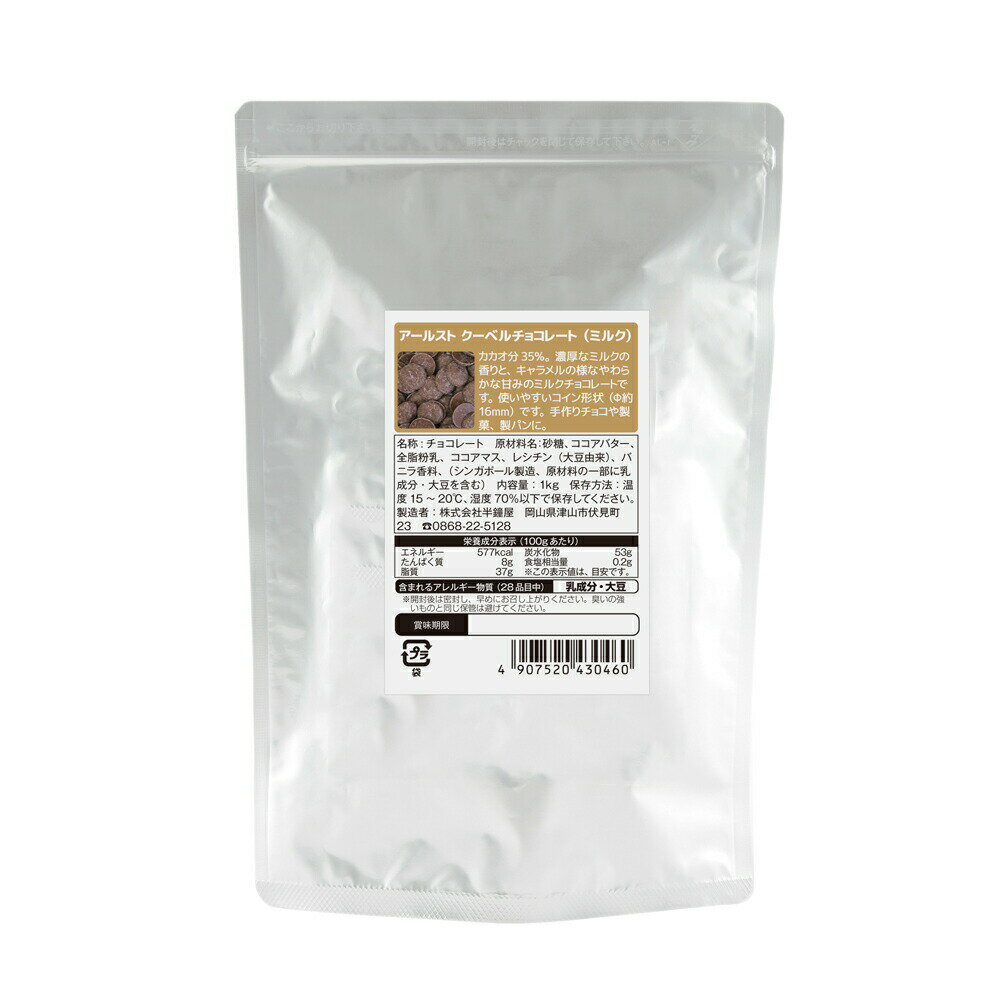 商品名 アールスト クーベル チョコレート ミルク(コイン形状タイプ) 原材料 砂糖、ココアバター、全脂粉乳、ココアマス、レシチン(大豆由来)、バニラ香料、(シンガポール製造、原材料の一部に乳を含む) 商品規格 1kg 商品特徴 シンガポール、アールスト社のクーベルチュールチョコレートです。